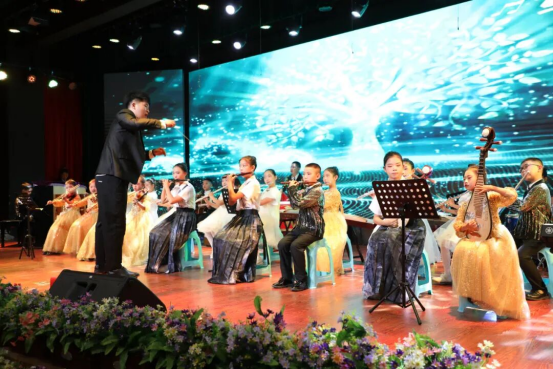 文艺演出现场,管弦乐演奏《光辉十年逐梦前行》。
