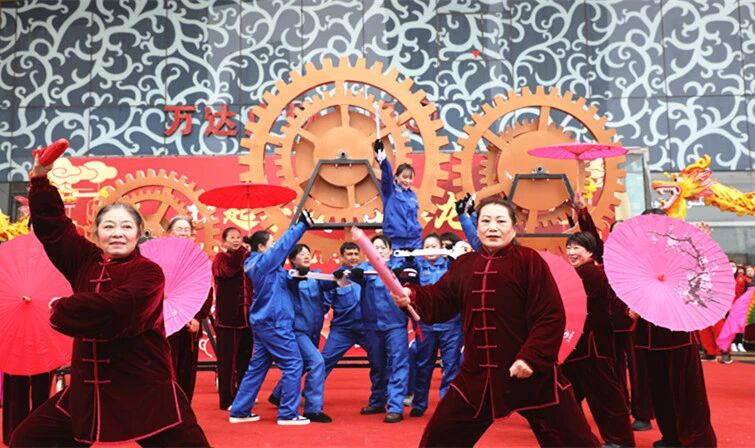 本次展演的最大亮点,在于巧妙融入了区域独特的科技与工业基因。嵩山街街道的演员们身着辖区企业工装,头戴安全帽,将一线生产场景搬上舞台,并与每日每夜企业IP玩偶“雪豹”“小每”及可口可乐“大白熊”趣味互动。北站东路街道则创意推出“东啦啦,福运到万家”方阵,巧妙化用辖区知名企业“货拉拉”之名,以“东啦啦”车队穿梭表演,寓意物流通达、幸福速递。压轴出场的头屯河街道更具气势,以巨型齿轮道具开道,产业工人们手持标志性的大扳手,舞步刚劲有力,将现场气氛推向高潮。