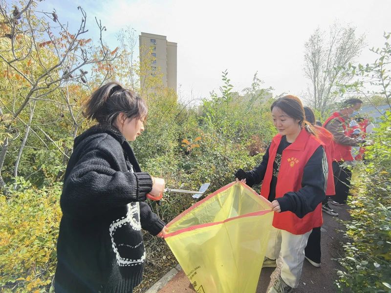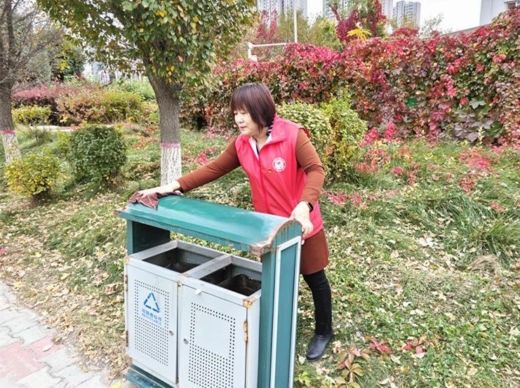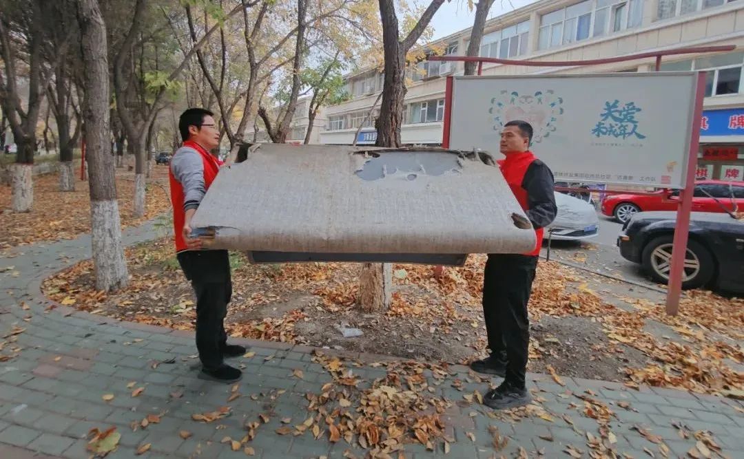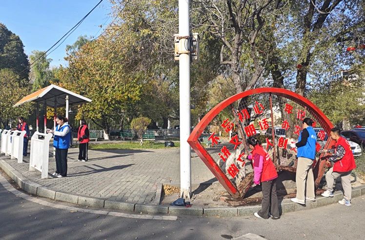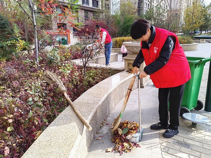 社区工作人员和志愿者们拿着扫帚、垃圾袋等打扫工具对辖区绿化带、落叶路段等进行清扫保障辖区环境整洁。