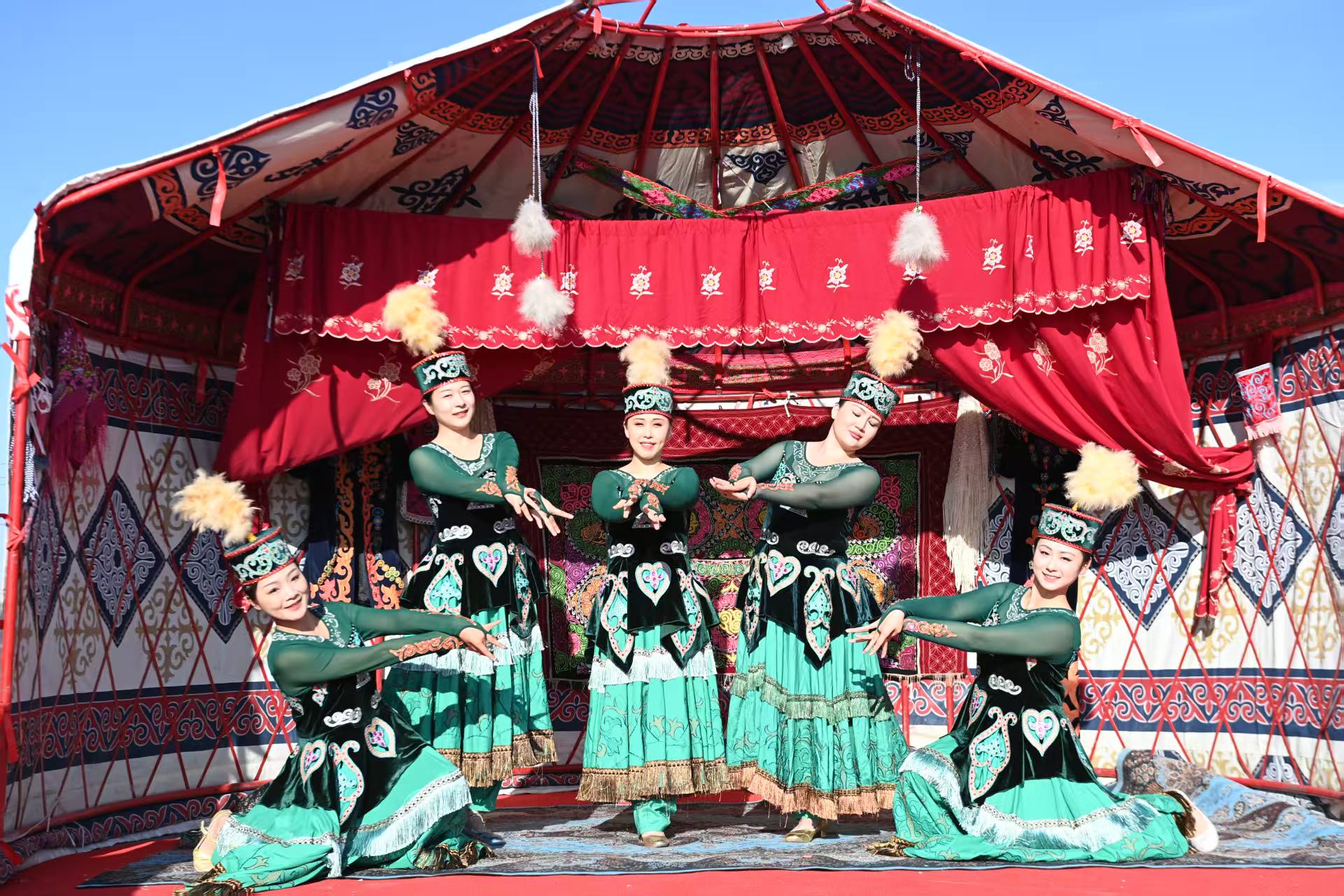 “恰秀!恰秀!”欢快的《恰秀迎宾曲》奏响,身着盛装的村民撒出糖果,将最诚挚的祝福传递给现场宾客;《黑走马》舞者踏着矫健舞步,用热情舞姿点燃全场氛围。欢呼声中,骆驼引路、绵羊成群、骑手飒爽的转场队伍缓缓登场,浩浩荡荡奔向富民新居,宛如一幅流动的游牧生活画卷。