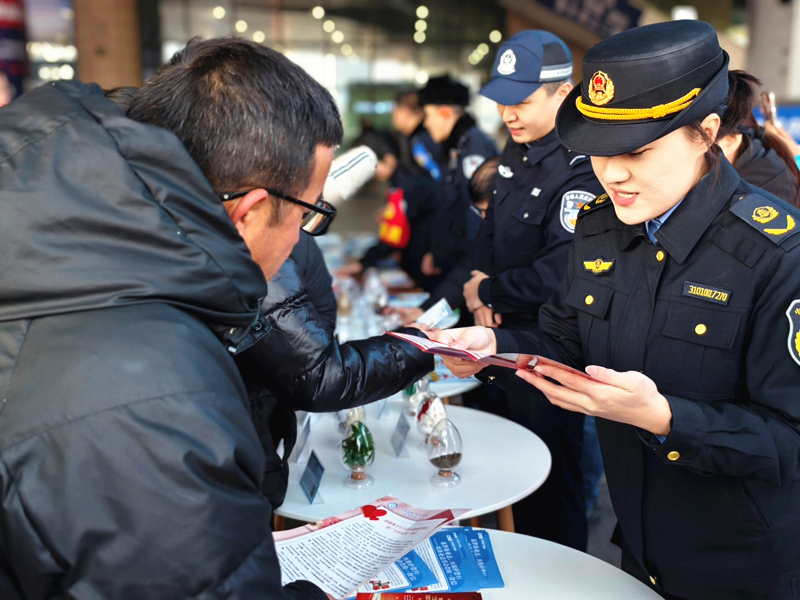 另一侧,“志愿红”传递暖心正能量。石榴红志愿服务队志愿者穿梭在客流中,为旅客提供出行问询、路线指引、行李帮提等便民服务;医疗志愿者为往来旅客及环卫工人免费测量血压,送上健康关怀。同时,志愿者与工作人员还向旅客发放宪法宣传册、文明出行手册及普法小礼品,引导大家增强法治观念、践行文明出行理念。