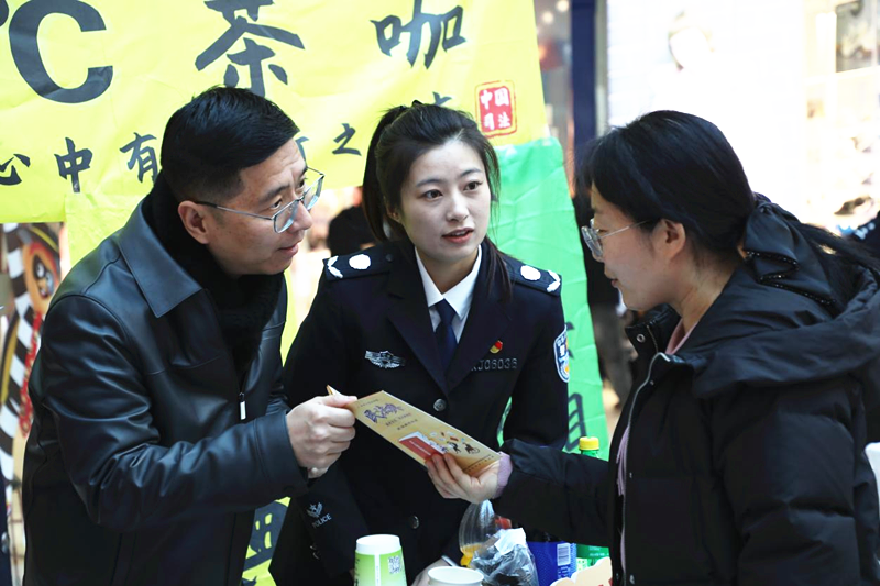 法“℃”茶咖便民服务摊位前,区司法局工作人员向市民普法。