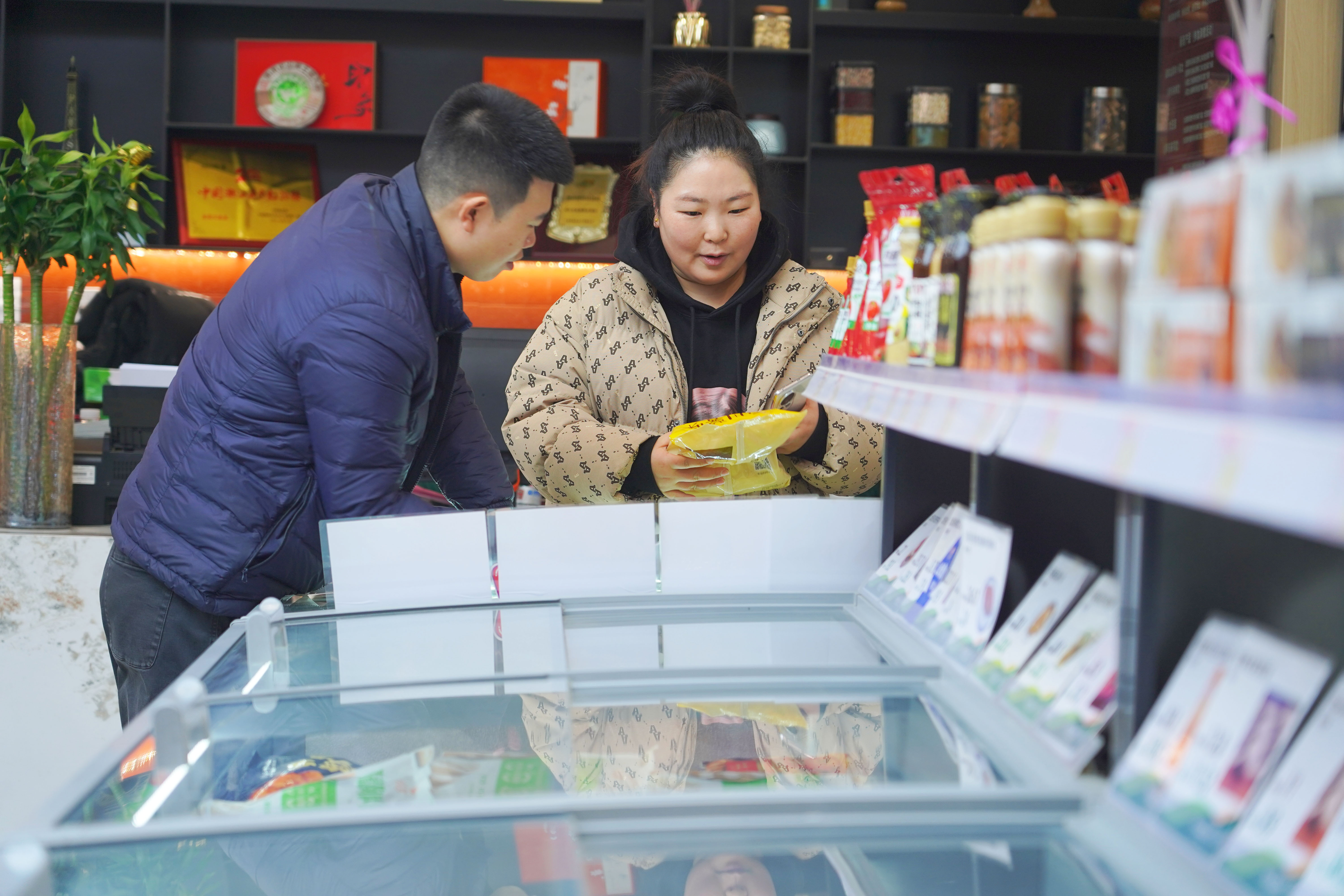 在年货节集中展示区,糖果、酒水、干果、肉制品等商品琳琅满目、整齐陈列,吸引不少市民驻足挑选。连续多年参加年货节的三杨店负责人宋小炎介绍,今年带来了哈尔滨红肠、江苏板鸭、四川腊肠、广式香肠等80种畅销肉制品,还推出适合走亲访友的礼盒装,更给出“礼盒满1000元减100元”“腌腊肉类每公斤价格让利10%”的优惠。