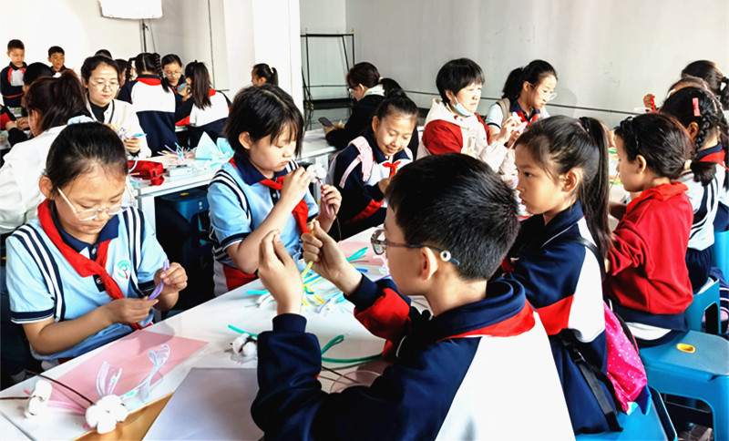 在“一带一路”地标文化博览园棉文化馆,乌鲁木齐市第92小学学生动手制作棉花花束。