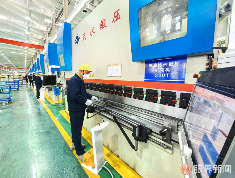 在中厚板容器载具的生产车间,工人正在操作电液比例数控折弯机。资料图片