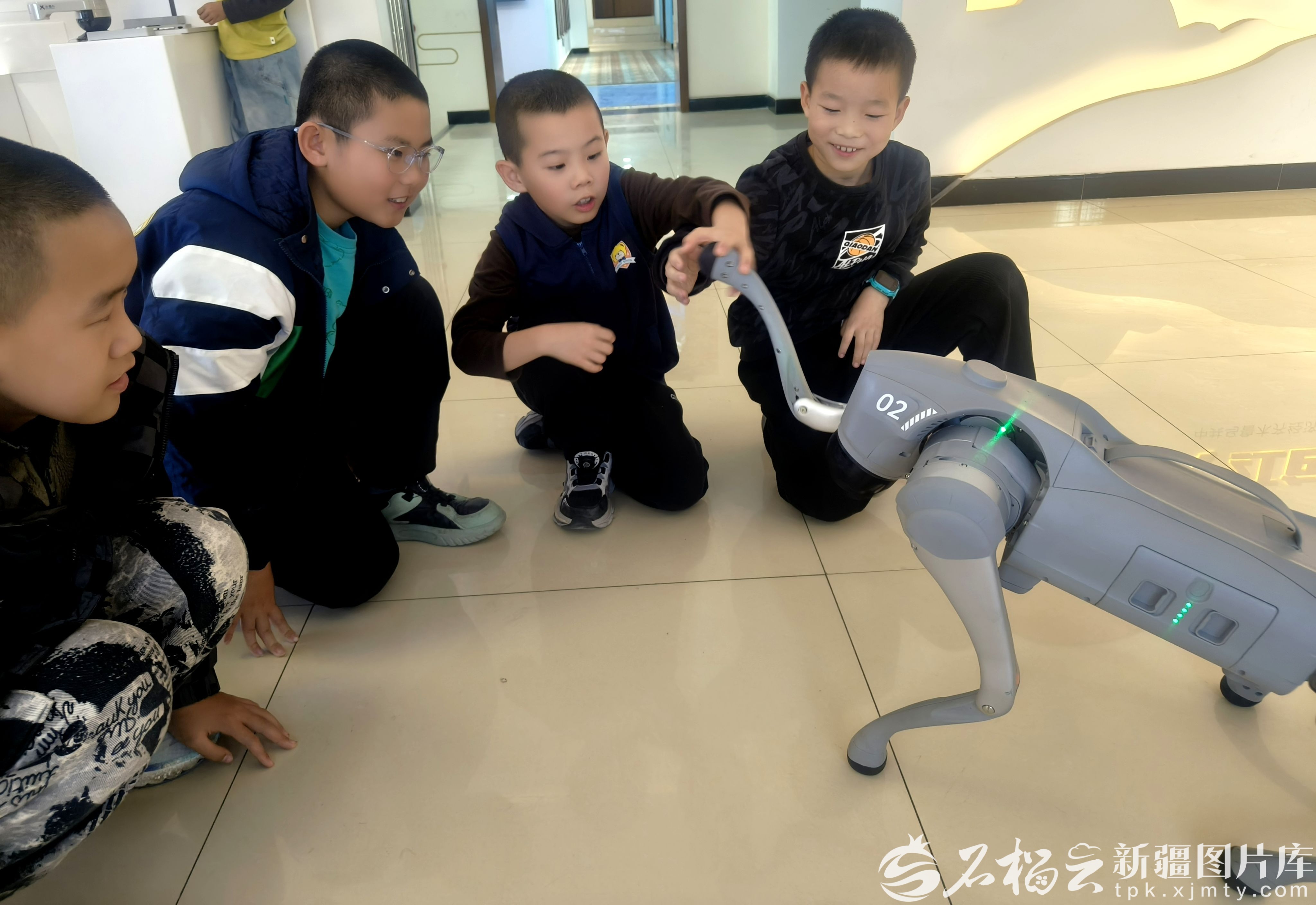 12月2日,乌鲁木齐经济技术开发区(头屯河区)中亚北路街道科技园社区科普馆VR红色教育基地内,孩子们与机器狗互动。