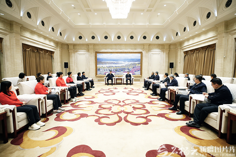 1月29日,自治区党委书记陈小江,自治区党委副书记、自治区主席艾尔肯·吐尼亚孜会见国家体育总局局长、党组书记高志丹一行。石榴云/新疆日报记者 谢龙摄