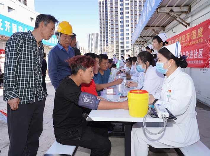 西安交通大学第二附属医院新疆医院(自治区人民医院白鸟湖医院)的医护人员为工人们提供免费医疗服务