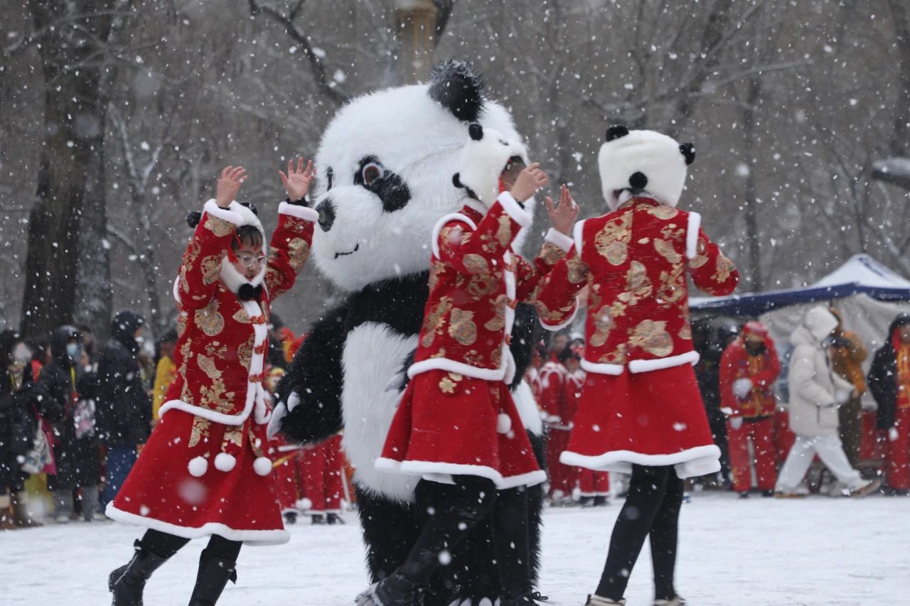 “过年啦!”“丝路经灵”社火队的萌娃们用俏皮可爱的舞蹈为现场观众送上新春祝福。功夫熊猫、宇航员、黑神话悟空等动漫IP人物和阿唛龙玩偶和着欢快的节奏与萌娃互动,充满童趣与活力的表演赢得观众阵阵掌声。市民张海龙说:“这些小朋友的表演非常喜庆,年味十足。”
