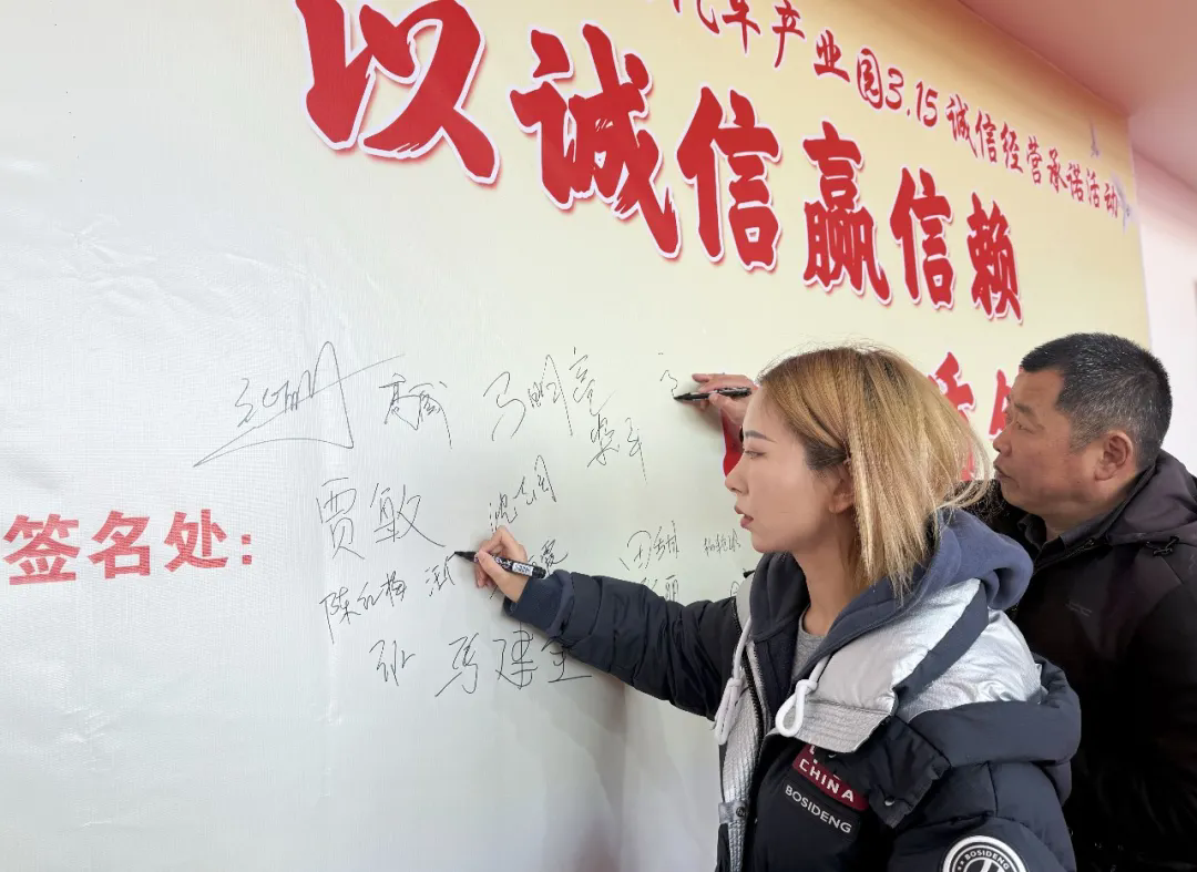 活动设置诚信倡议、承诺发言、签名践诺、知识问答及趣味套圈等多元环节,采用线上线下同步直播互动模式,吸引全体商户踊跃参与。活动中,园区发出诚信倡议,呼吁商户依法经营、诚信服务。商户代表现场表态、全体商户在诚信承诺墙上签名,作出诚信经营承诺。