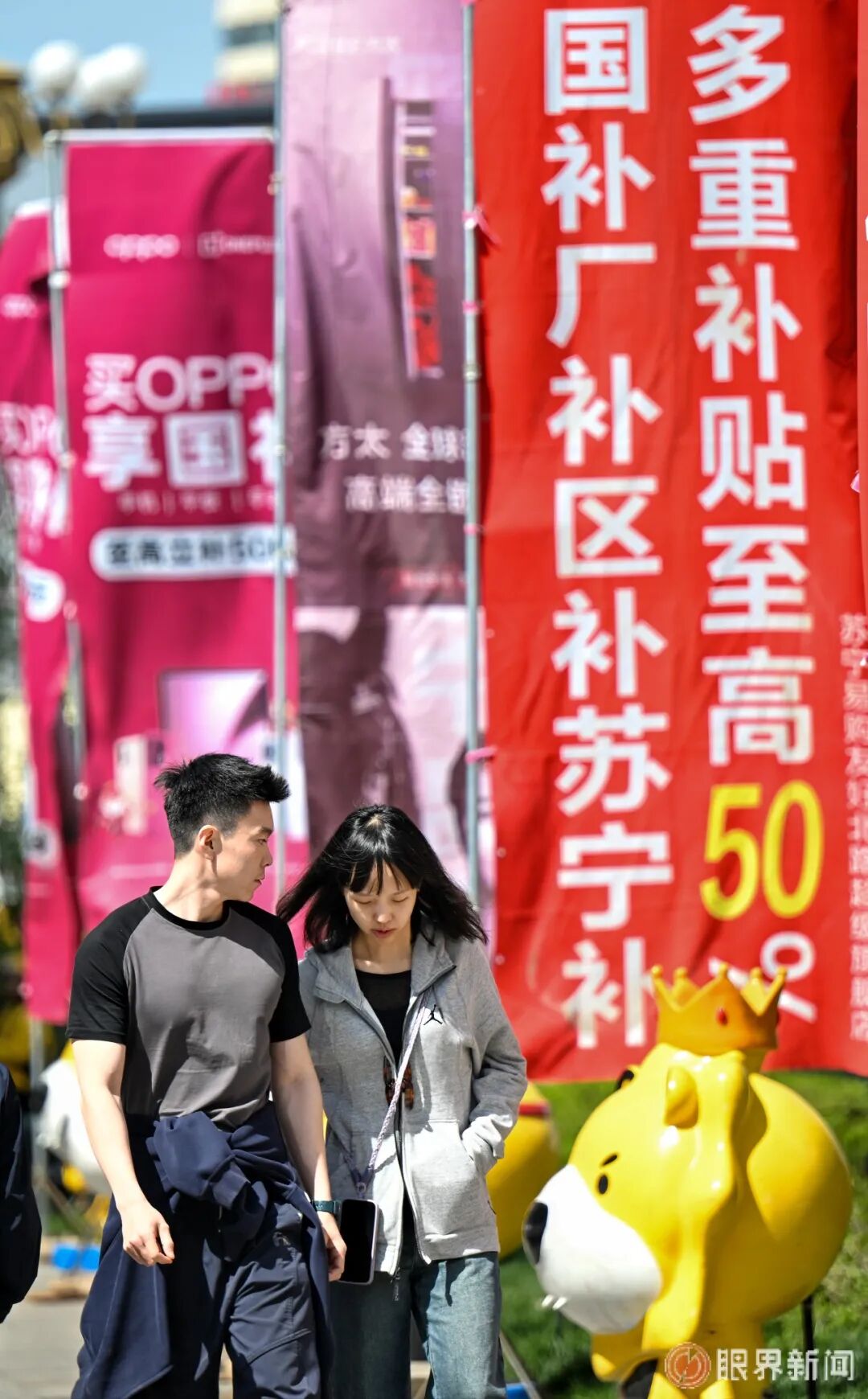 4月19日,苏宁易购(友好北路超级旗舰店)门前的促销条幅醒目悬挂,成为春日街头拉动消费的一道亮眼风景。记者迪丽娜尔·加力肯摄